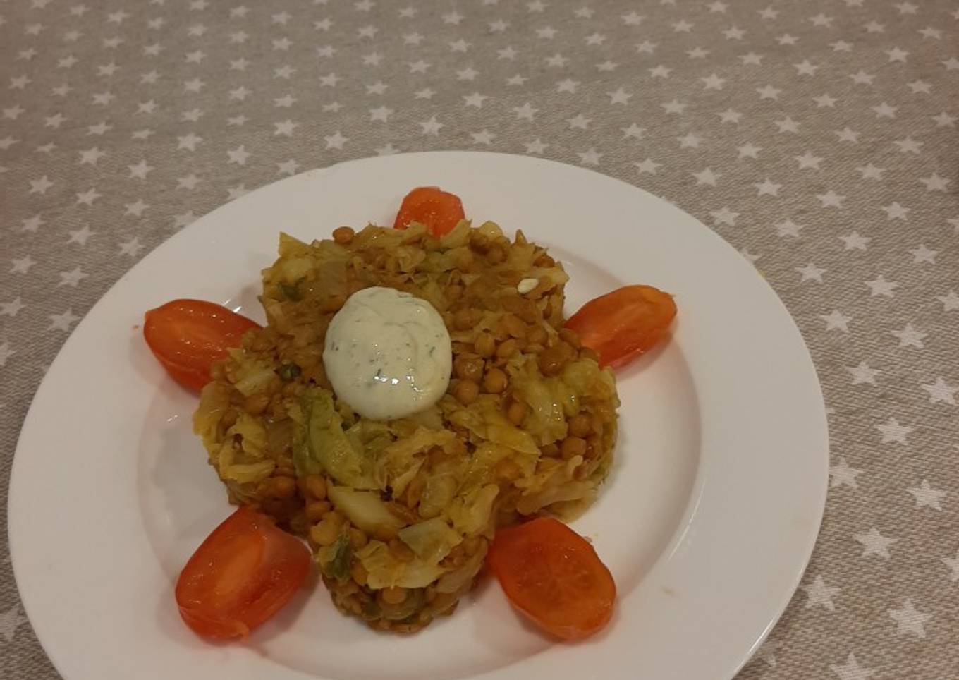 - Cuando ya esté frito se añade un poco de agua ya reservada de la col y se incorpora las lentejas y el comino, sal y cúrcuma.